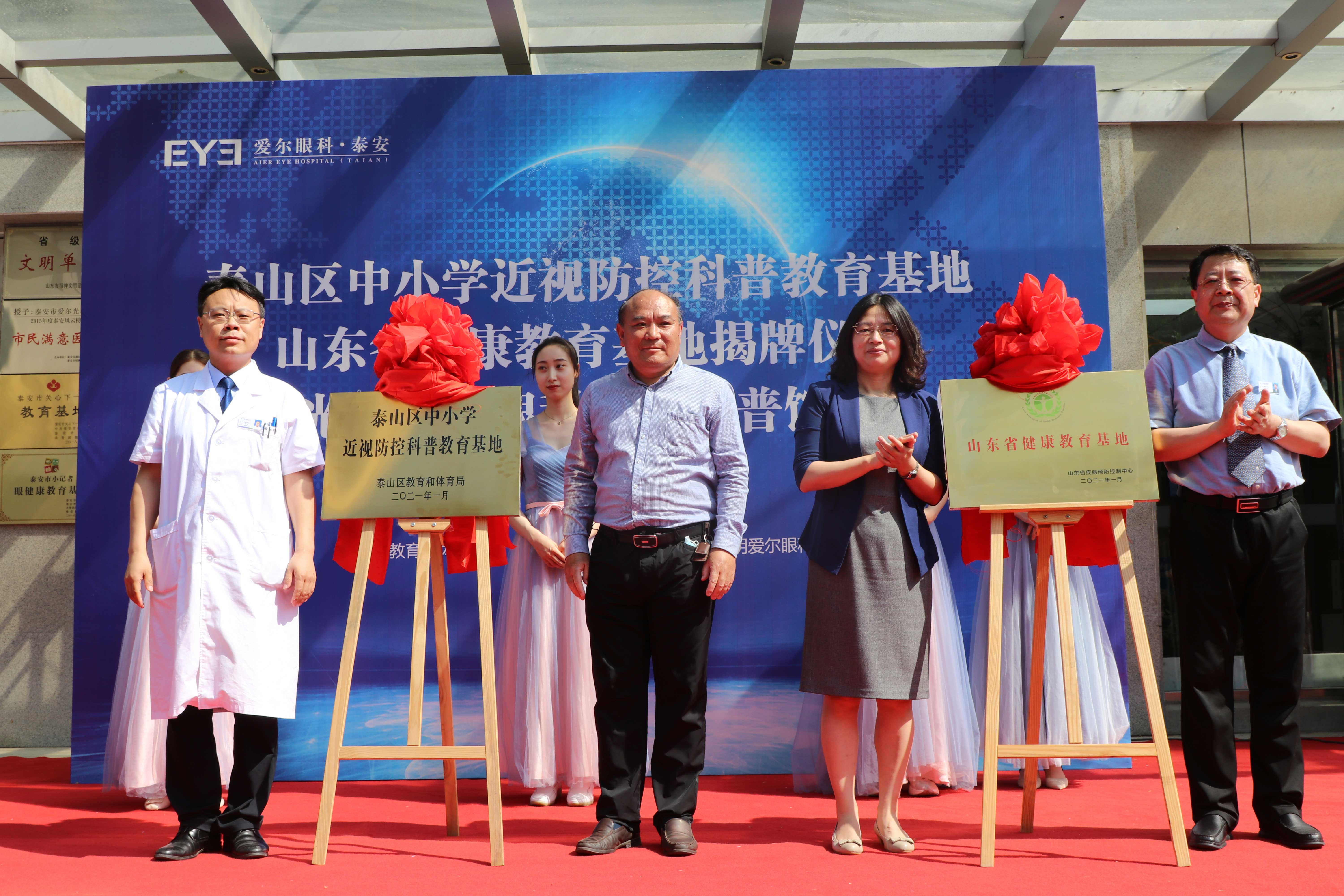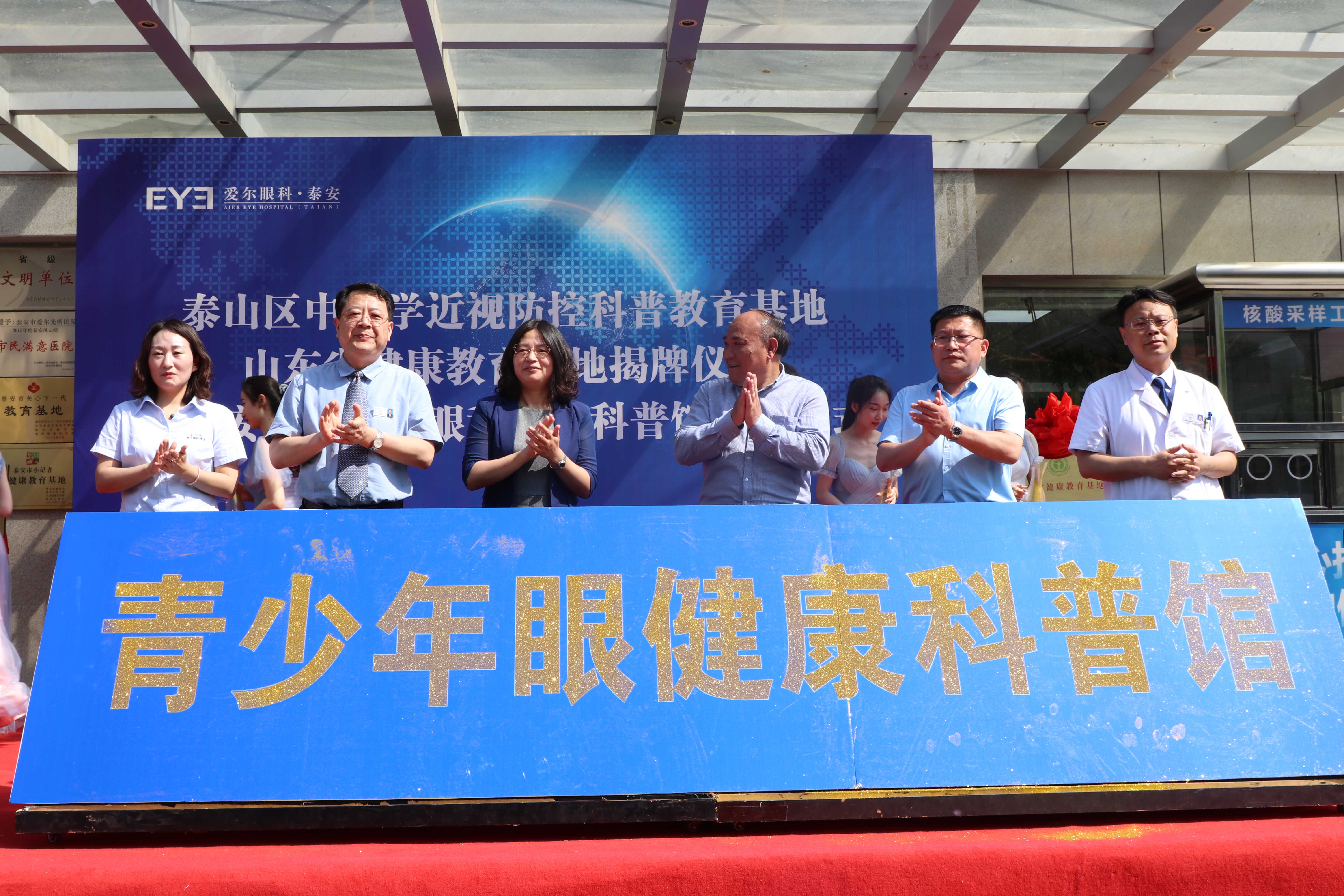 ? ? ? ?九點(diǎn)二十分,“山東省健康教育基地”和“泰山區(qū)中小學(xué)近視防控科普教育基地”正式揭牌。隨后,泰山區(qū)衛(wèi)生健康局黨組成員、副局長寧方莉、泰山區(qū)教育和體育局副局長高京杰、泰山區(qū)疾病預(yù)防控制中心副主任梁洪濤、泰安光明愛爾眼科醫(yī)院CEO楊敬昌、院長范傳峰、社會(huì)公益部主任王海燕登臺(tái),宣布泰安市眼健康科普館正式啟動(dòng),并向市民免費(fèi)開放。